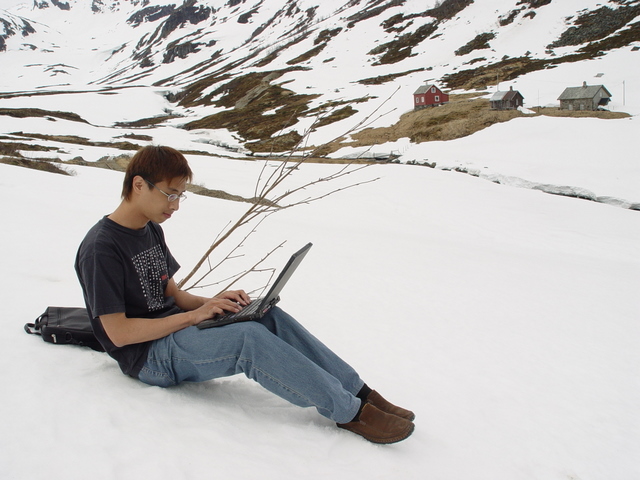 由於火車轉乘轉得不好,我們在前往Oslo之前要先在Myrdal停4個小時。Myrdal因為地勢稍高,冰雪尚未溶解,剛好我這輩子還沒見過這樣子的冰天雪地,開心地到處跑跑跳跳,還脫了衣服坐在雪地裡寫論文裝認真。其實屁股都溼了......