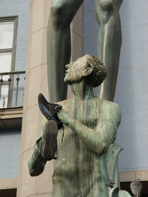 世界各地都有愛搞怪的死小孩,不過這個死小孩有創意,夠噱頭。這是在一個市場旁的噴水池雕像,不知道為什麼這座雕像看起來會這麼噁心,而且手上還被人戴上一雙臭鞋子,害我在那邊狂笑好久。