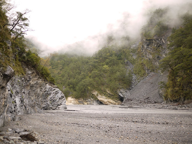 那個男的漂了十幾公尺後勉力起身,但漂嫂就這樣漂過了河道轉彎處,在我們視力所及處消失了。阿貴大喊叫剩餘還沒渡完的人快上岸,而已經上岸的人則丟下背包跑到下游處救人。這一刻我的腳痛仍釘在腳上,只能希望追過去的人能傳來好消息。我們邊攀渡過這個河彎,過程中我不斷在想漂嫂會怎麼渡過跟我相同的這刻鐘。繞過河彎後,前方的人終於傳來好消息,原來漂嫂漂過河彎後擱淺在一處遠方沙洲上,阿貴把她救起拉到岸邊解除危機,也釋放了放手人的愧疚。