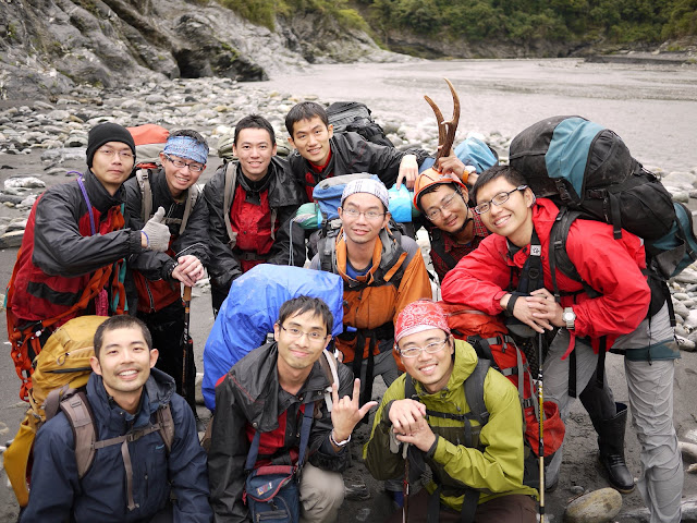 一早醒來,第一件事就是摸睡袋有沒有溼,結果令人開心。坐起來望向溪水,感覺河面比昨天更寬廣了些,心中暗叫不妙,難不成昨日合十人之力的練成陣失敗了?大家收拾細軟後走向河邊,紛紛找尋重回文明的直線。正當大家都在猶豫之際,阿鎧以一人之姿開始渡入河中,沒人想到河水竟然止深於膝,今日河道已完全不同於昨日。我們重拾信心,開始一路往下游擺渡而去。