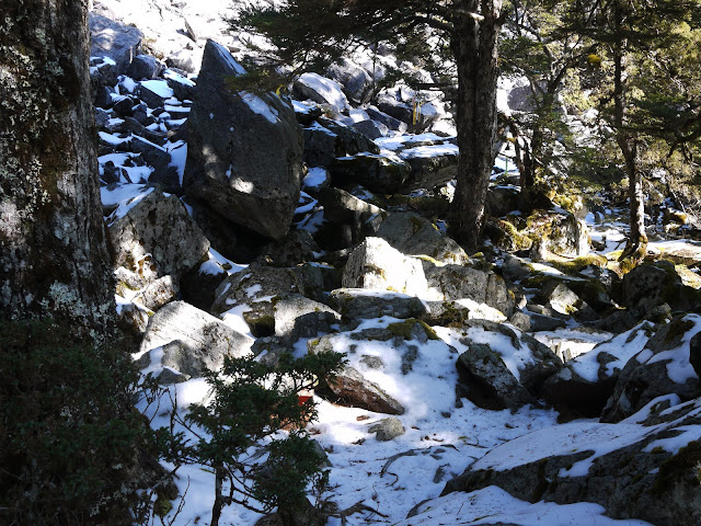 見到早晨的陽光是件令人愉快的事,無論身處何處。起身走過全面結凍的司晏池,今日的白姑大山只獨享於私,因再無其他隊伍出現於司宴。出發後約莫一小時來到白姑東南峰,此處遠眺白姑大山有如一座大平台,平整的山頭不覺陡峭,只覺路途仍然遙遠。隨海拔不斷升高,殘雪開始滋長,最後爬滿前方的山路,我們只能放慢腳步抓緊岩角,提心不被硬滑的殘雪帶到山崖下。